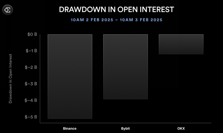 他估计总爆仓金额在80亿至100亿美元之间。这与各交易所24小时内观察到的未平仓合约减少量更为相符合,Bybit的未平仓合约总量从2月2日至3日减少了40亿美元,而币安一家则减少了50亿美元。