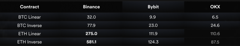 Bybit和OKX等其他交易所,这种折价幅度并不明显,ETH合约的折价接近1%。三个交易所的BTC合约表现好于ETH,因为抛售主要集中在ETH合约,特别是币本位(反向)合约上。